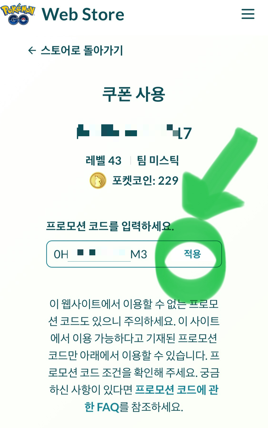프로모션 코드가 보이고 바로 옆에 적용 버튼이 보여요.