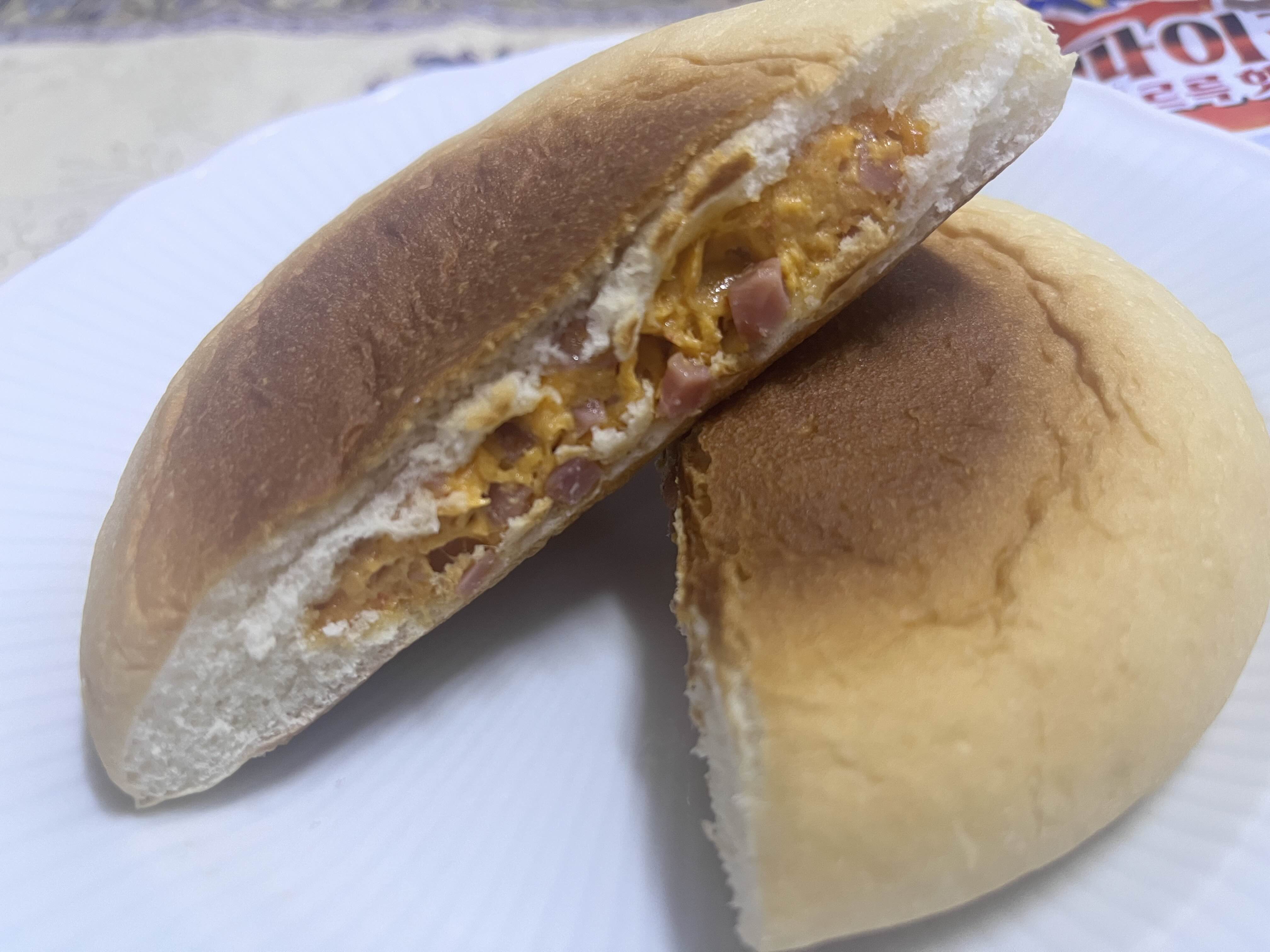매콤한 치즈 소스에 작은 햄 조각들이 들어있는 빵이예요.