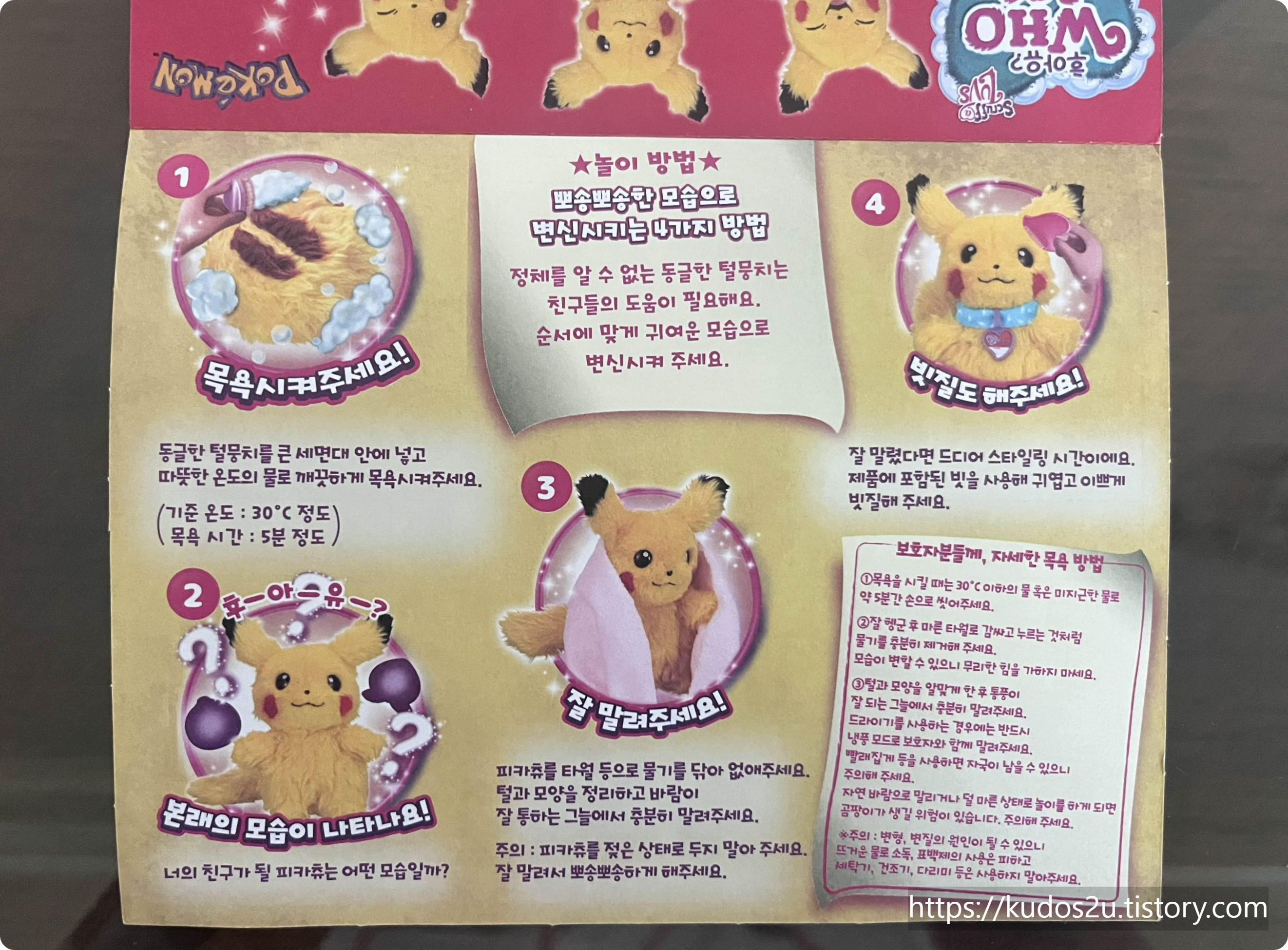 씻겨주면 동그란 털뭉치가 피카츄가 되는 장난감이예요.
