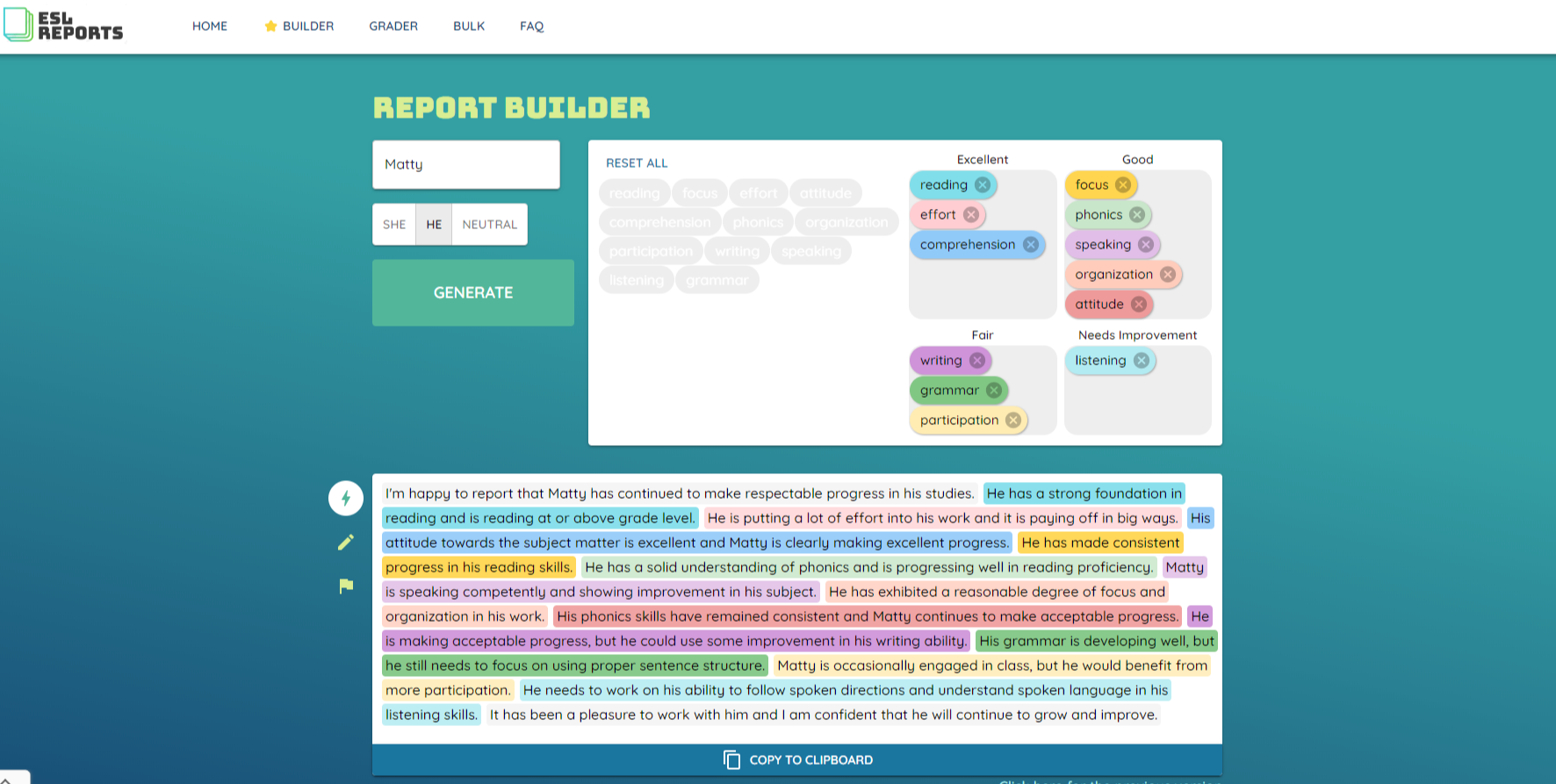 I'm happy to report that Matty has continued to make respectable progress in his studies. He has a strong foundation in reading and is reading at or above grade level. He is putting a lot of effort into his work and it is paying off in big ways. His attitude towards the subject matter is excellent and Matty is clearly making excellent progress. He has made consistent progress in his reading skills. He has a solid understanding of phonics and is progressing well in reading proficiency. Matty is speaking competently and showing improvement in his subject. He has exhibited a reasonable degree of focus and organization in his work. His phonics skills have remained consistent and Matty continues to make acceptable progress. He is making acceptable progress, but he could use some improvement in his writing ability. His grammar is developing well, but he still needs to focus on using proper sentence structure. Matty is occasionally engaged in class, but he would benefit from more participation. He needs to work on his ability to follow spoken directions and understand spoken language in his listening skills. It has been a pleasure to work with him and I am confident that he will continue to grow and improve.