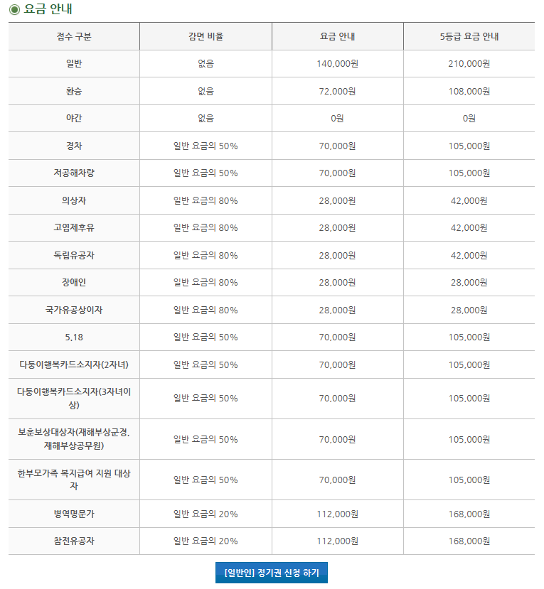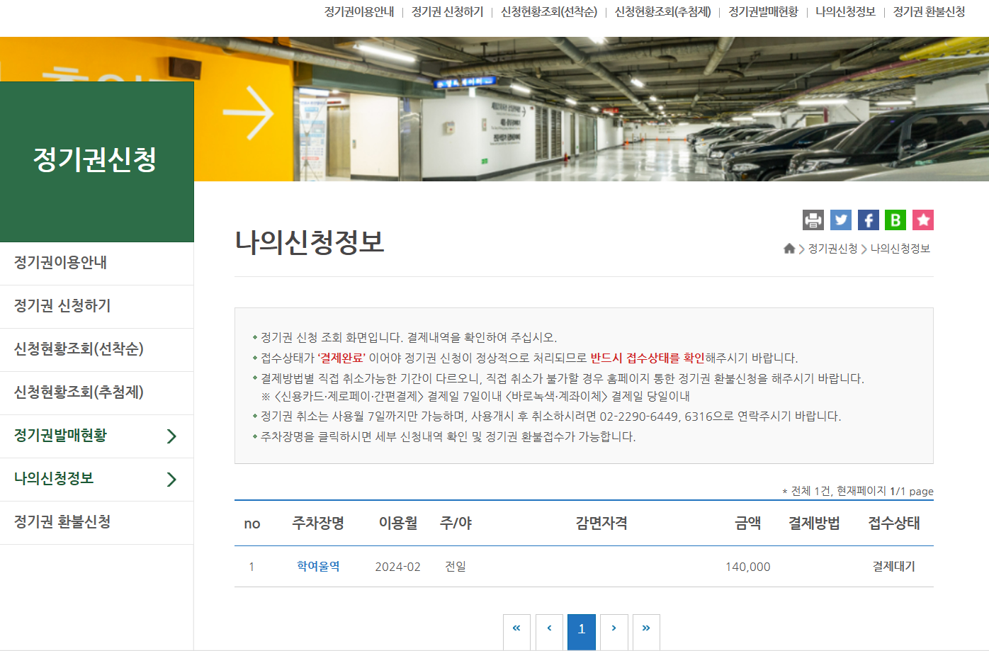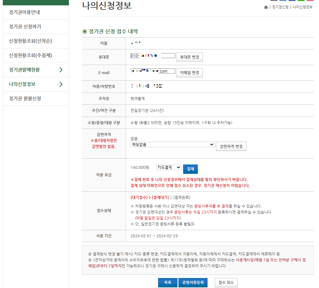 정기권 신청 접수내역이 나오고 결제할 수 있는 버튼이 보여요.