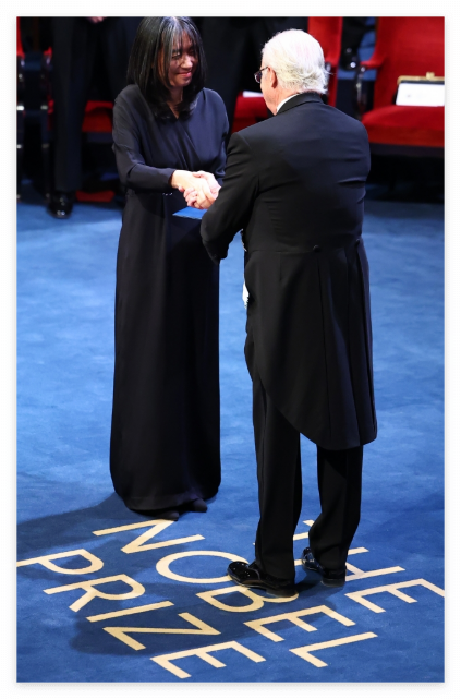 이로써 한강은 한국 문학의 위상을 한층 높이며, 세계 문학사에 큰 발자취를 남겼습니다. 한강 작가는 이날 검은색 원피스를 입고 물리학상, 화학상, 생리의학상, 경제학상 수상자들과 함께 블루카펫을 밟으며 입장했습니다. 네 번째로 호명된 한강은 칼 구스타프 16세 스웨덴 국왕으로부터 메달과 증서를 수여받았습니다.