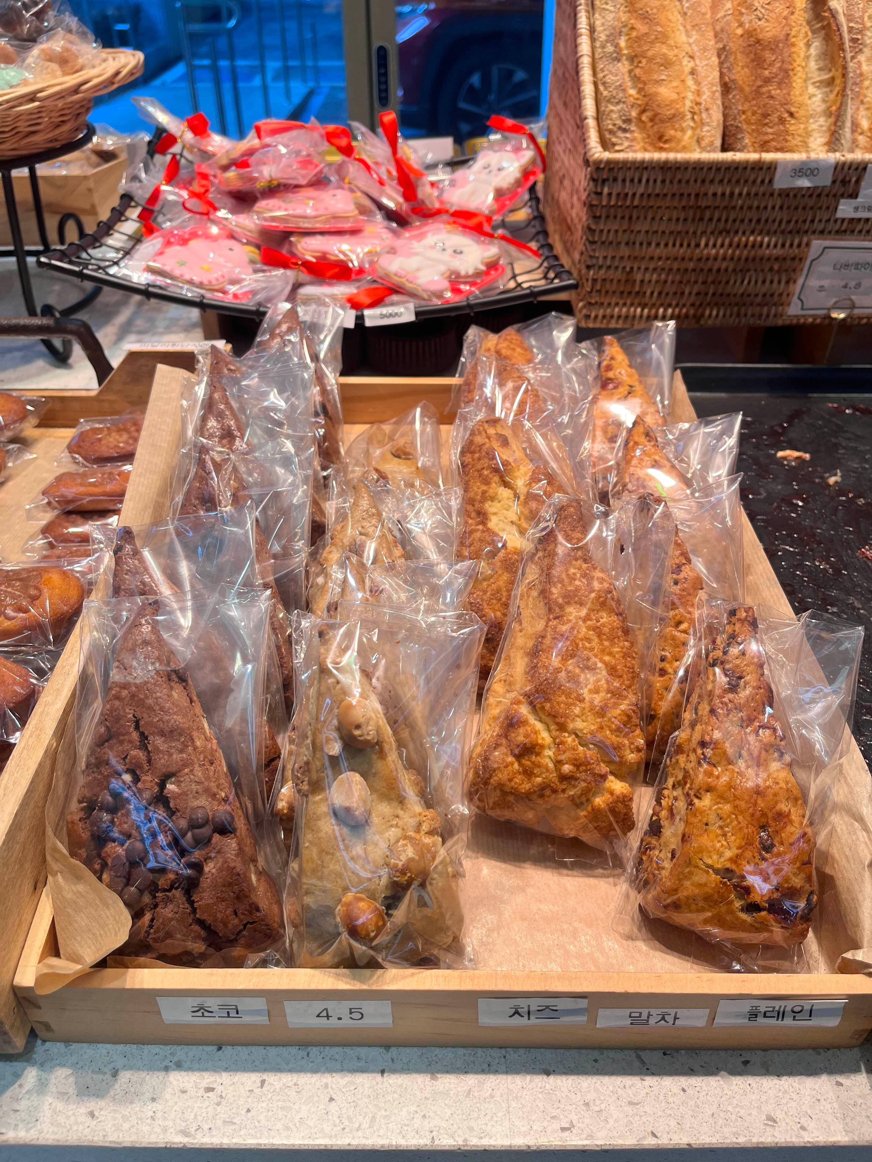 입구 앞에 보여지는 다양한 종류의 빵들에 시선을 뺏기게 되요.