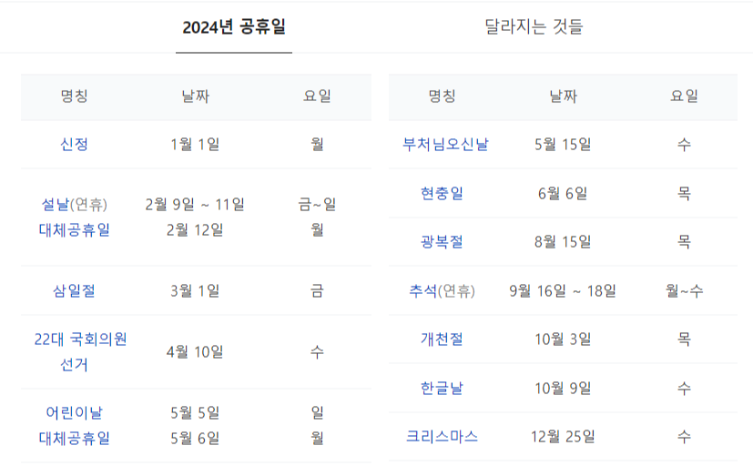 2024년의 공휴일과 달라지는 것들이 있네요. 참고해 주세요.