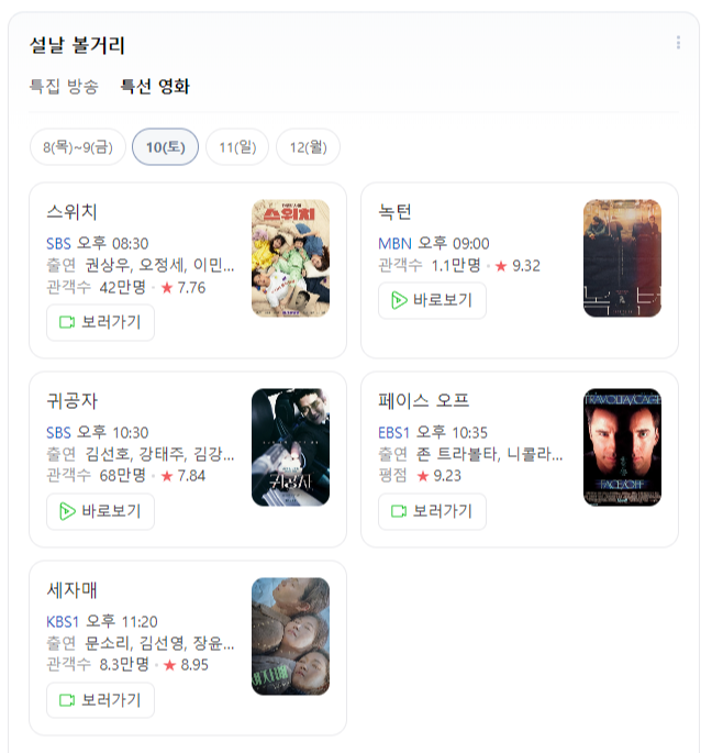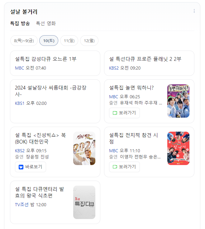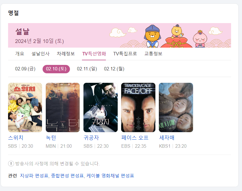 카테고리 없음 2024 구정 설날 볼거리 특집방송 & 영화 편성표 by 엄마표영어 이재은작가 2024. 2. 10. 반응형 새해 복 많이많이 받으세요!! 오늘 구정 당일 TV 설날 볼거리가 재밌는 게 많네요. 영화도 그렇고요 :) 구정 설특집 예능도 재밌어 보이고, 영화도 그동안 눈여겨 봤던 것들이 방영되어 기대되요!! :) 구정연휴 설날 볼거리 가족들과 친지들과 즐겁게 보시며 새해 복 많이많이 받으세요!! 아래 바로가기로 확인하시면 되요 :) 반응형 공유하기 게시글 관리 영어교육에 진심인 엄마 저작자표시 (새창열림)