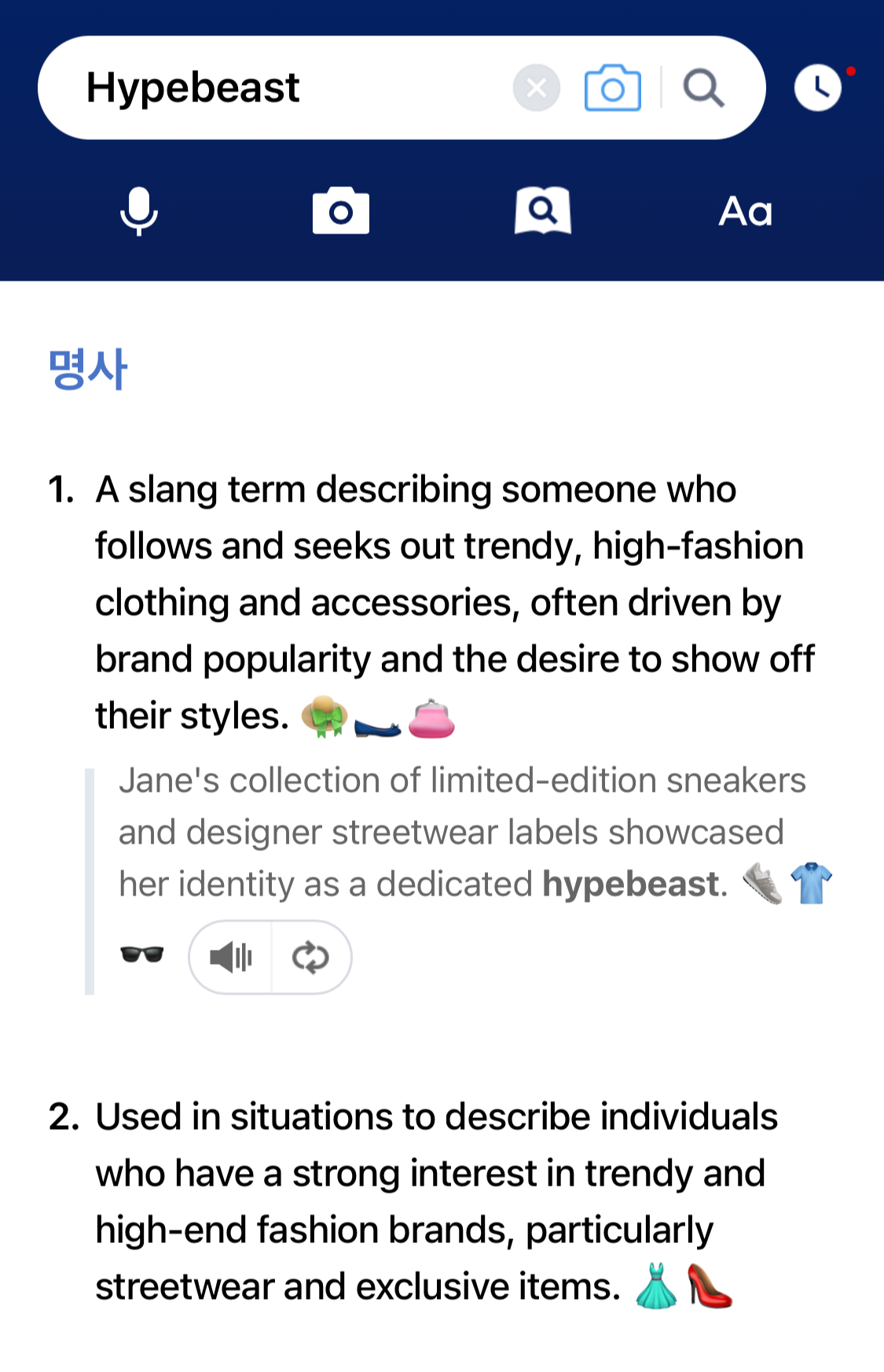 - Jane’s collection of limited-edition sneakers and designer streetwear labels showcased her identity as a dedicated hypebeast. (제인은 희귀 스니커즈와 디자이너 스트릿 브랜드들을 모아서, 자신이 진정한 하입비스트라는 걸 보여줬다.)