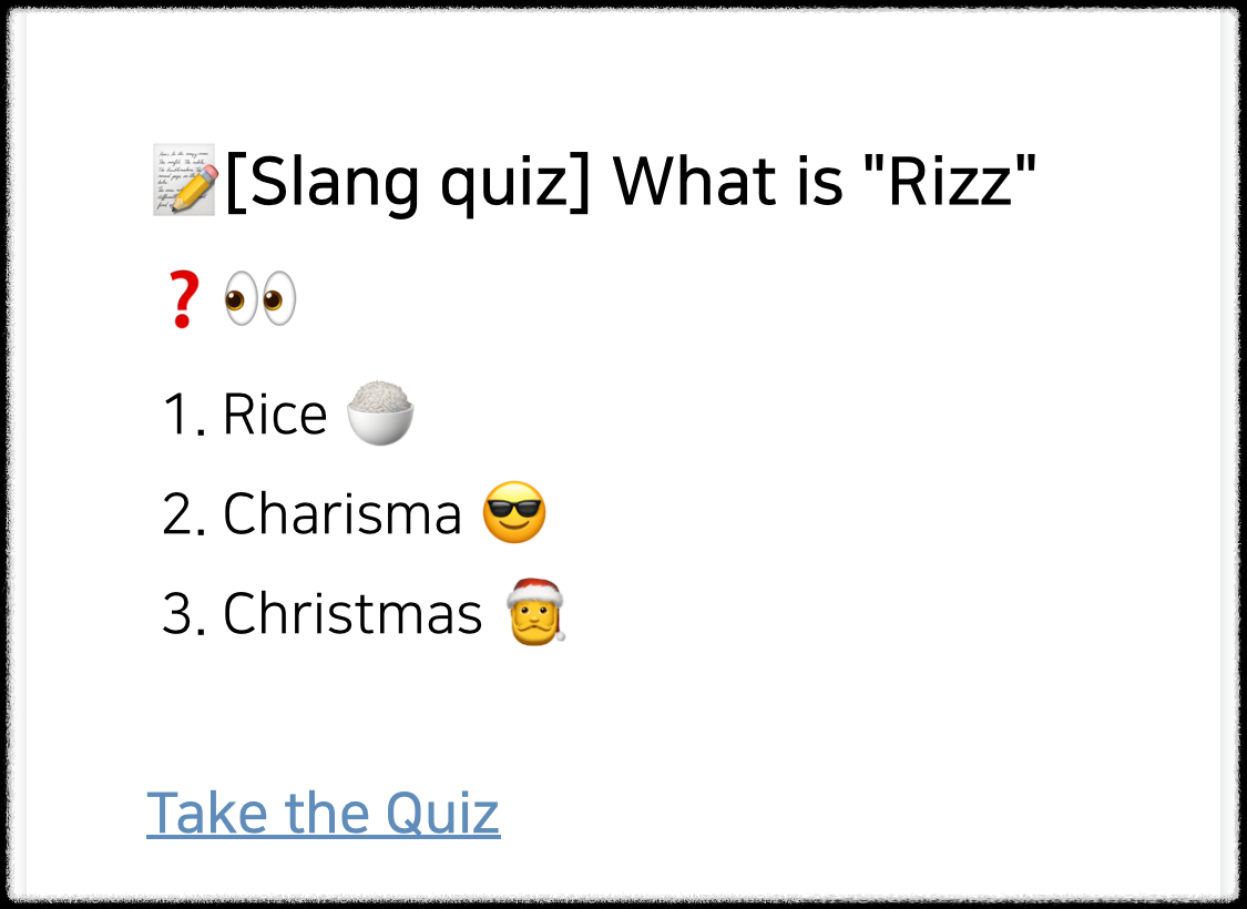 안녕하세요! 요즘 영어 슬랭에 관심이 많으신 분들께 오늘은 인터넷에서 화제인 단어, "Rizz"에 대해 소개해 드릴게요.
