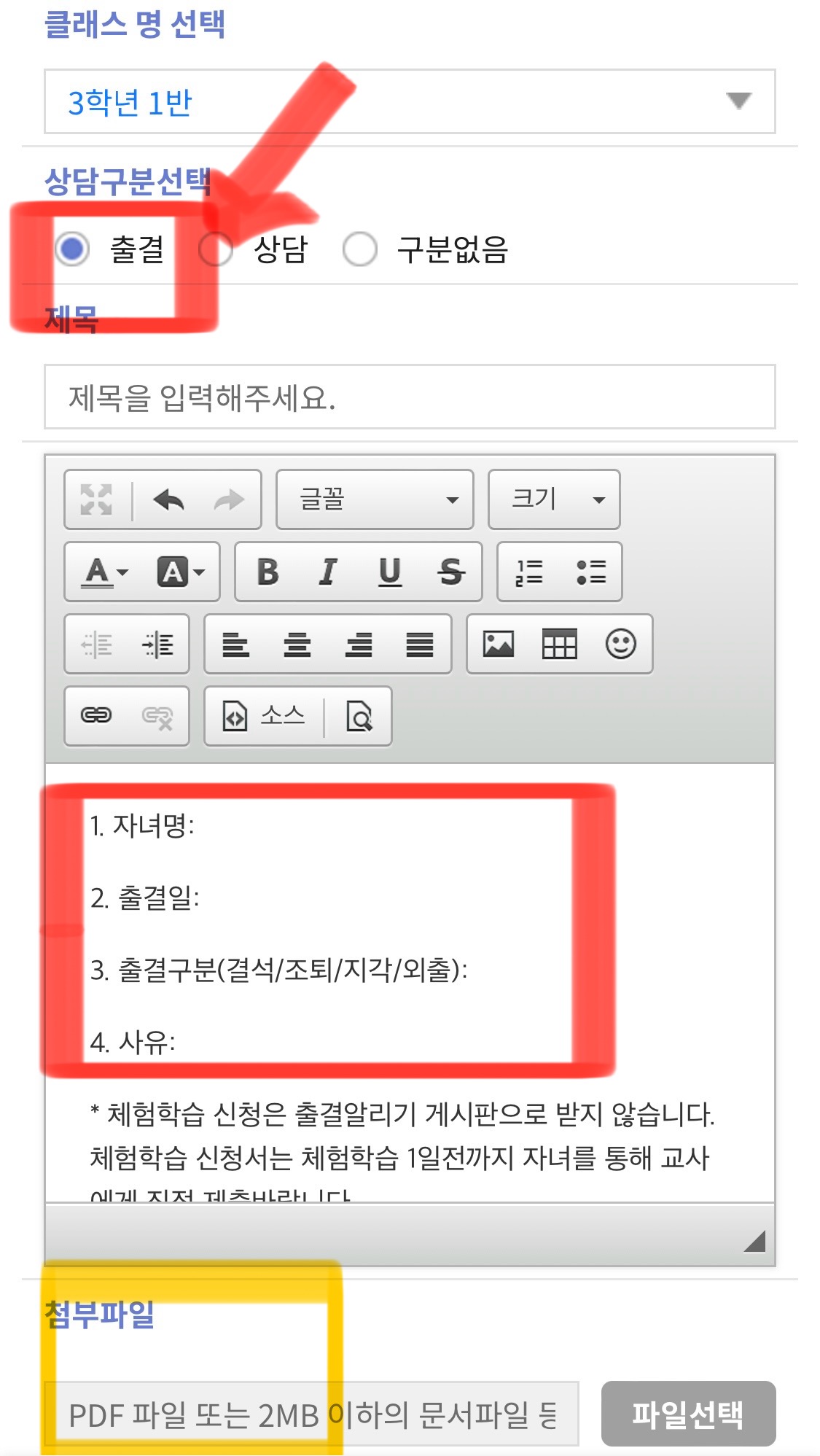 첨부파일로 결석계나 체험학습 보고서 양식 등